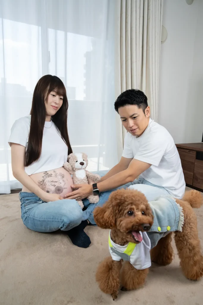緊張しながらも優しさにあふれたご夫婦、控えめで最高のタイミングでカメラ目線をくれるワンちゃん、自然光が気持ちよく入るお部屋。