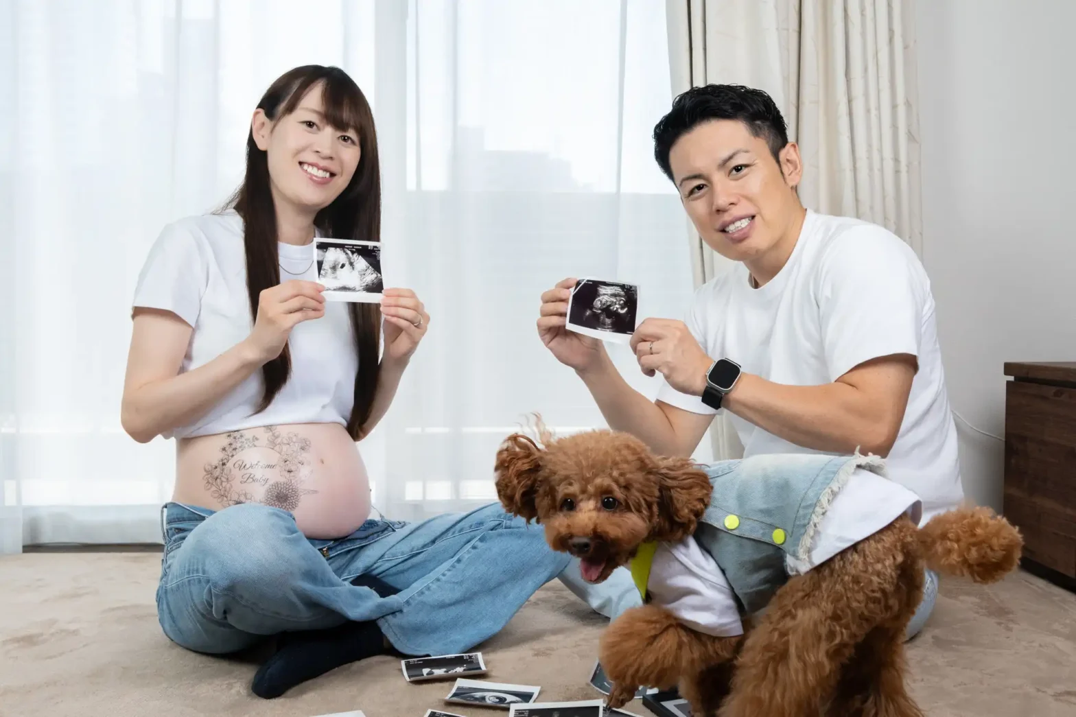 緊張しながらも優しさにあふれたご夫婦、控えめで最高のタイミングでカメラ目線をくれるワンちゃん、自然光が気持ちよく入るお部屋。