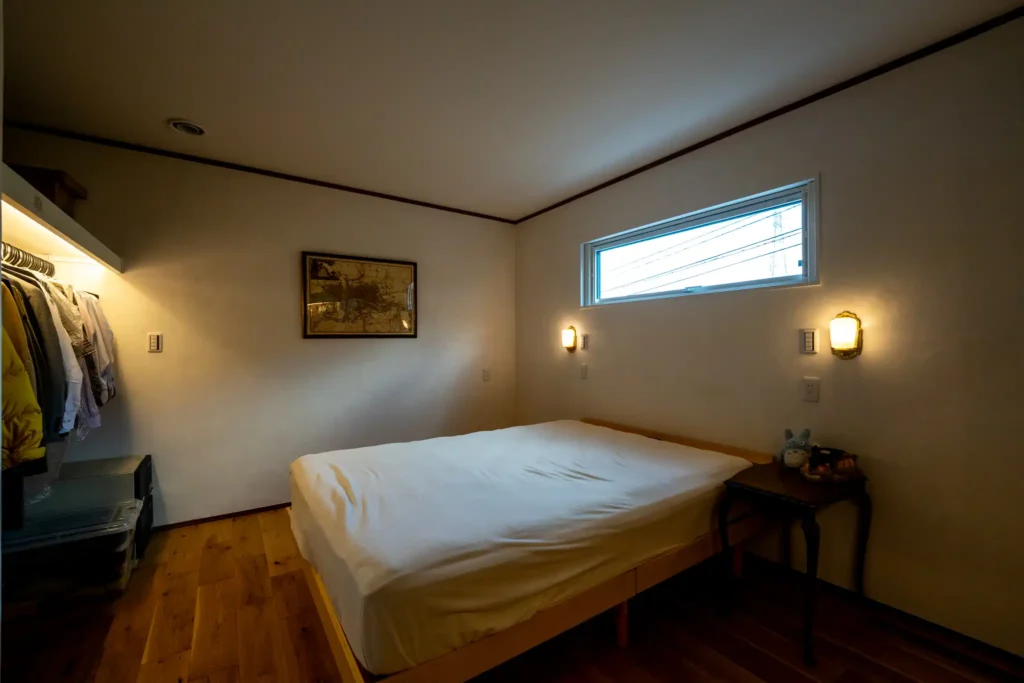 寝室にはやわらかな自然光が差し込み、朝はこの光で目覚めたら気持ちいいだろうな、と素直に思える空間。