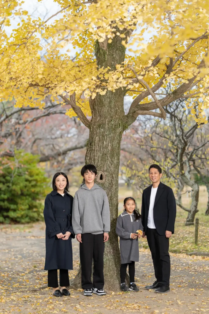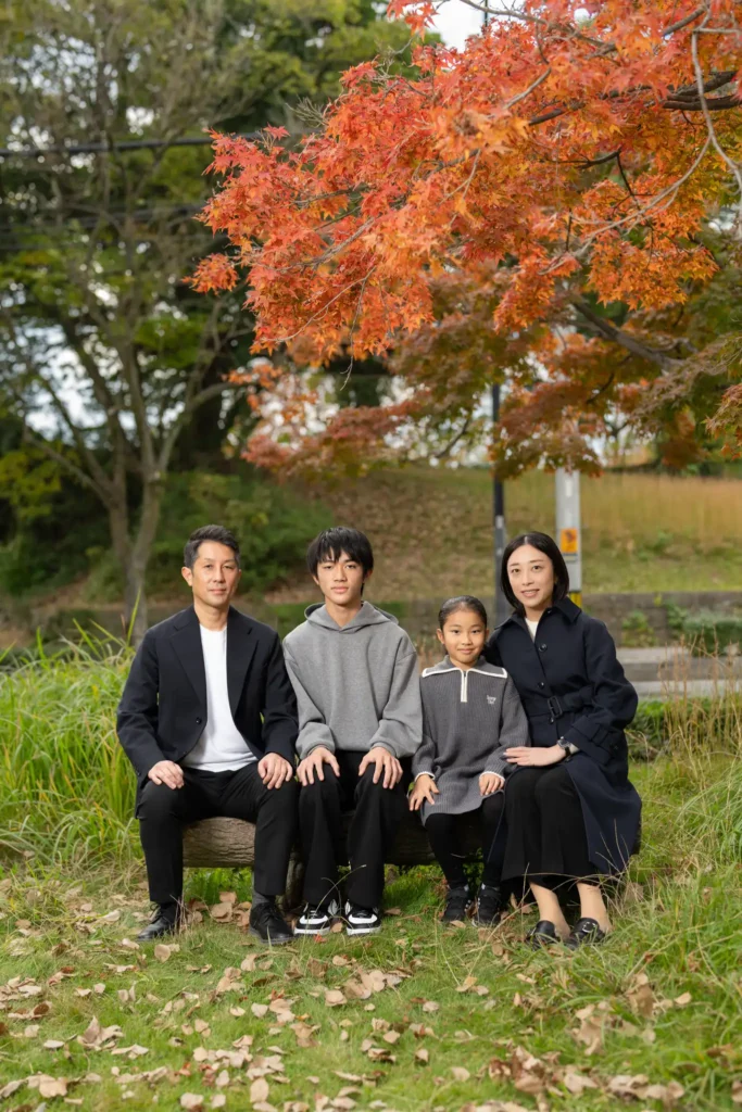 秋は特に、 赤やオレンジに色づいた木々が写真に奥行きを与え、 スタジオ撮影にはない自然な空気感を表現できます。